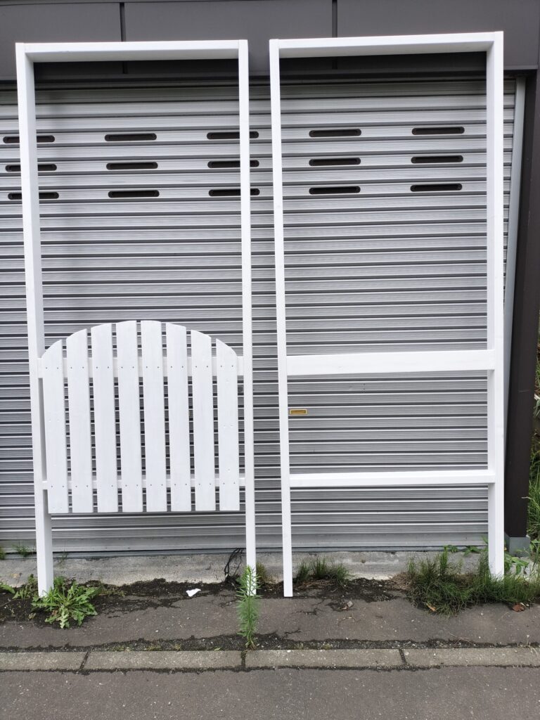 このアーチのポイントは、目隠し+誘引+デコレーション台の3役をこなす構造です。