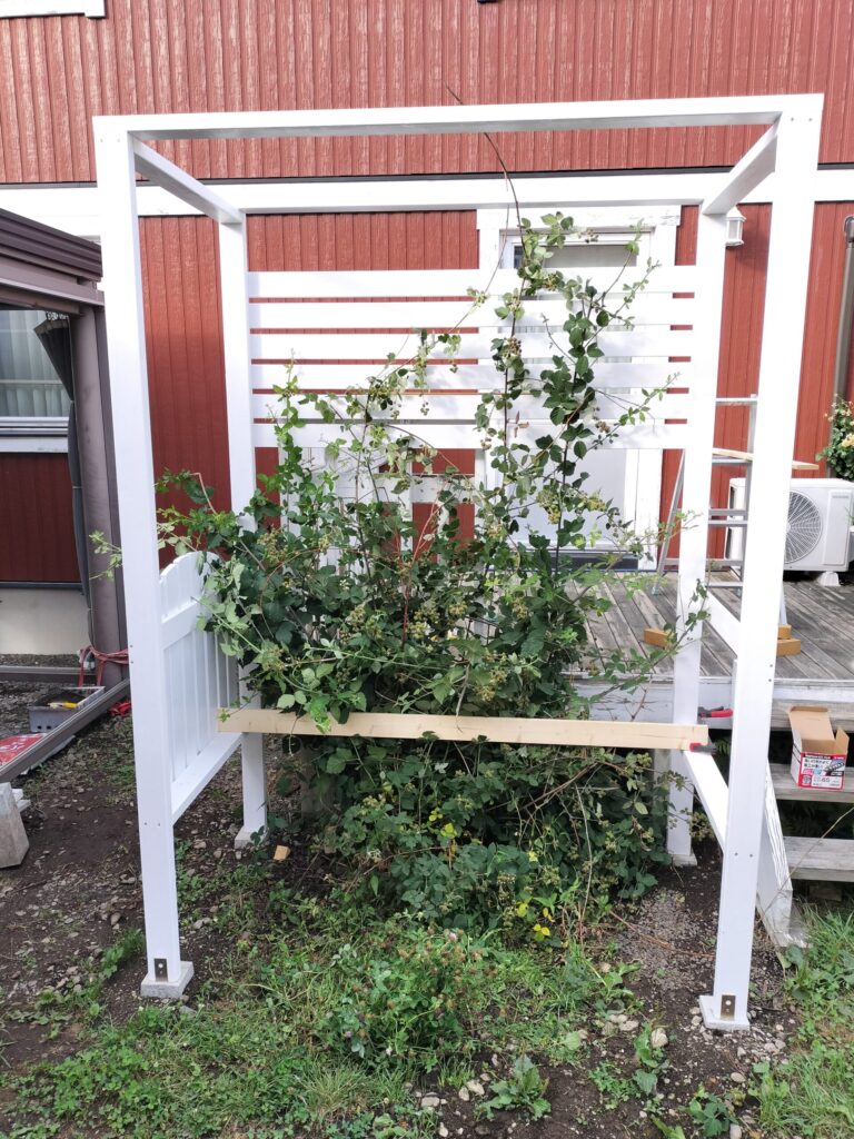 お隣との間にナチュラルな目隠しを|ブラックベリーを誘引できる木製アーチをDIY