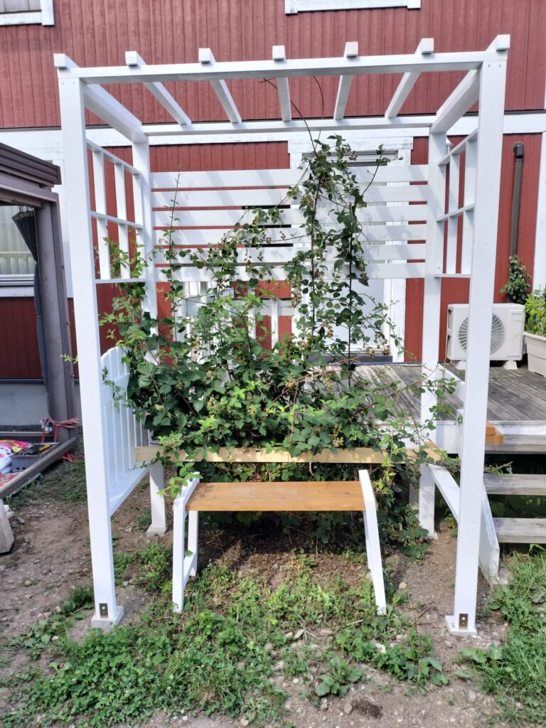 庭で作業する時間が増えると、のんびり休憩することも多くなりますが、そんな時に気になるのがお隣さんとの“目線”。ウッドデッキでくつろぐ時に「目線を遮るものが欲しいなあ」と感じていたのと、ブラックベリーが手付かずで伸び放題だったこともあり、自然に目隠しができるブラックベリーの誘引を兼ねた木製アーチをDIYすることにしました。