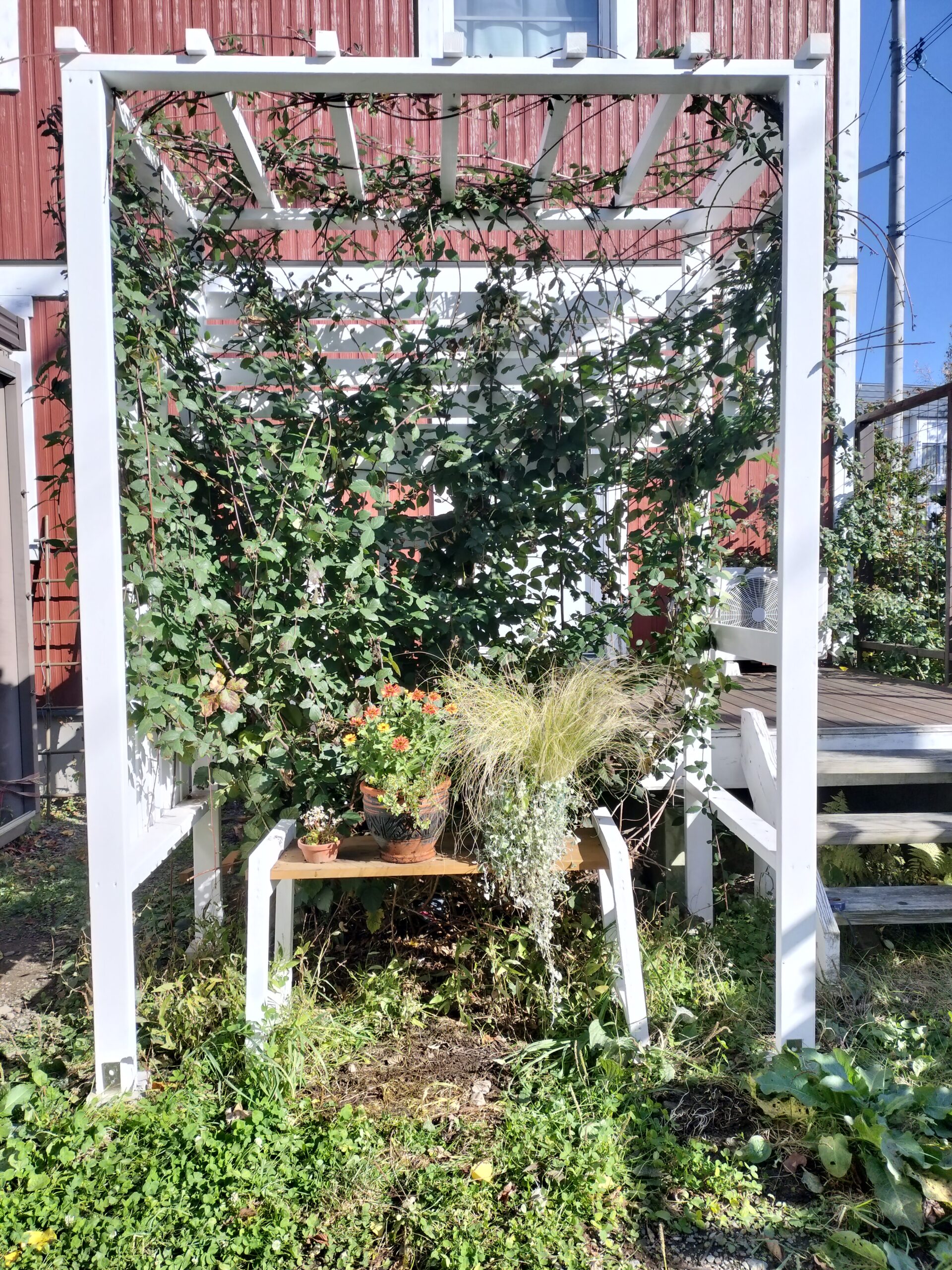 アーチの内側には木製ベンチを設置し、鉢植えや小物を飾り”映えスペース”が完成しました!