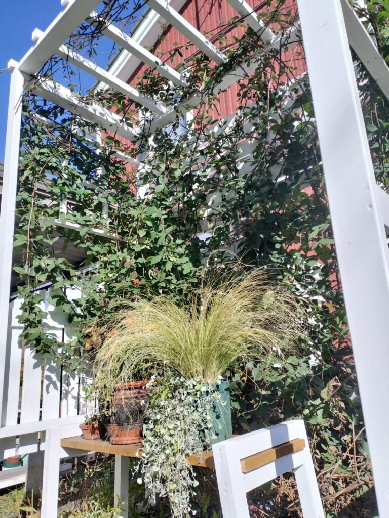 格子部分や背面、屋根部分にブラックベリーの枝をゆるく誘引します。