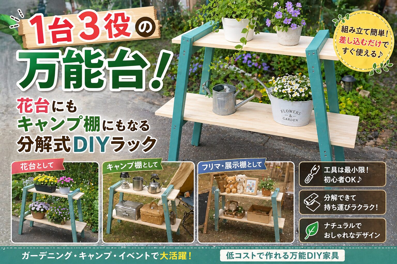 「花台 × フリマ展示棚 × キャンプラック」の3役をこなす万能台の作り方を紹介します。