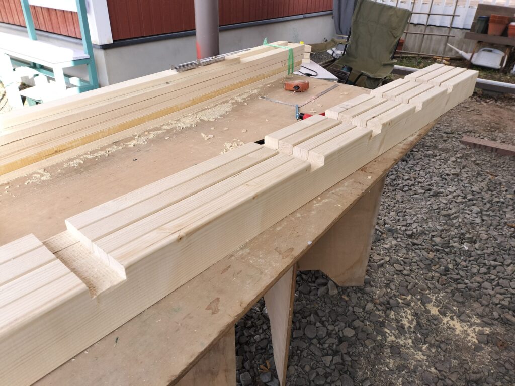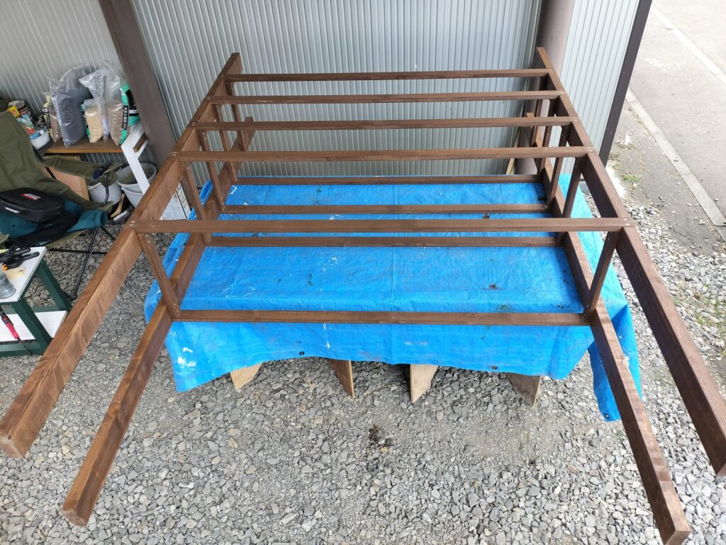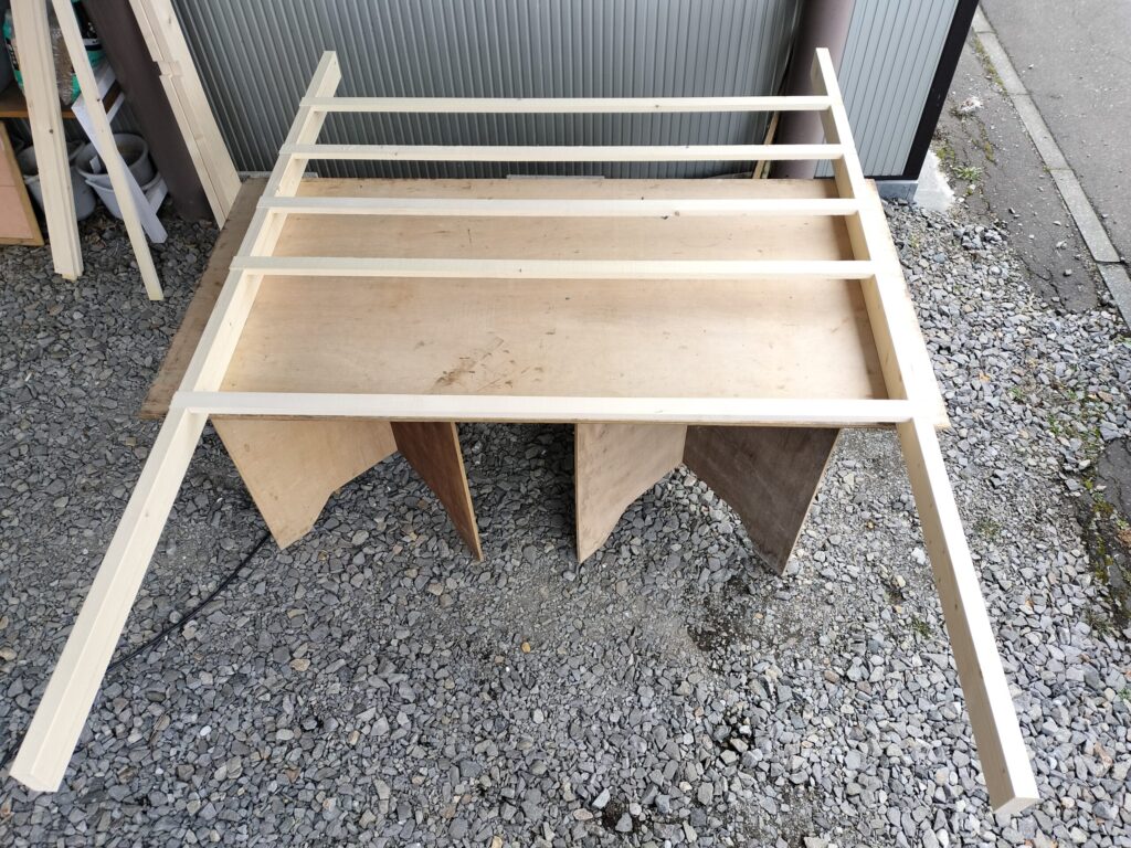2×4材を使って全体のフレームを組みます。サイズが大きいので、しっかり固定しながら組むのがポイントです。