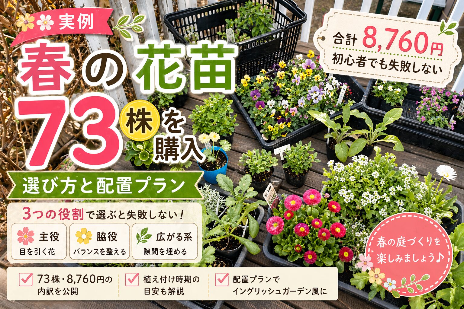 そこで今回は、実際に春の花苗73株・合計8,760円を購入した実例をもとに、初心者でも失敗しにくい花苗の選び方、バランスよく見える配置のコツ、コスパよく揃える考え方を写真付きでまとめます。