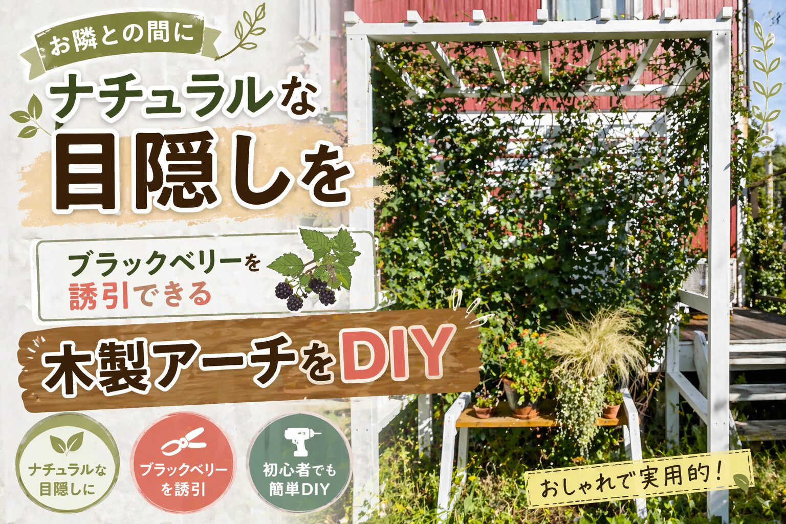 このアーチのポイントは、目隠し+誘引+デコレーション台の3役をこなす構造です。